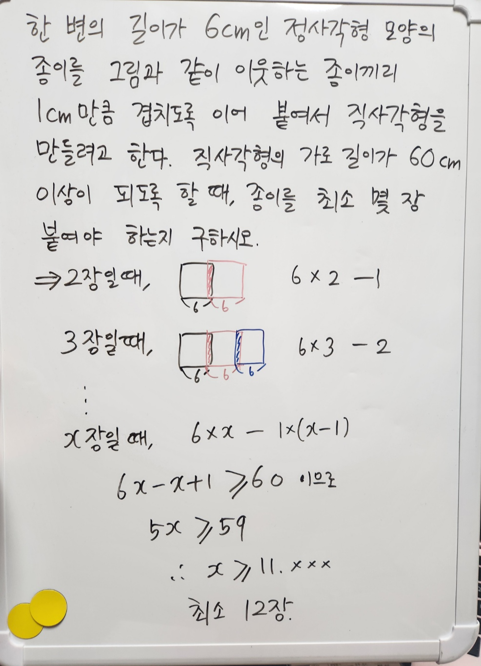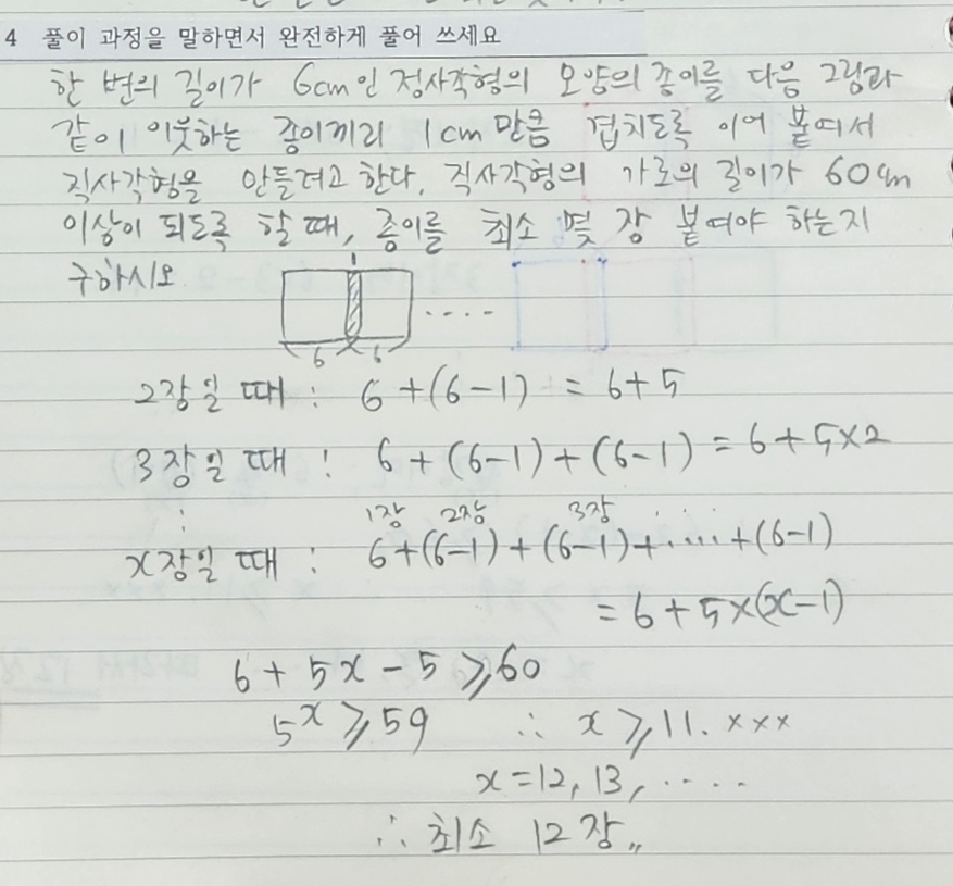 (문제 암송 및 연습장에 쓰기) "한 변의 길이가 6cm인 정사각형 모양의 종이를, 이웃하는 종이끼리 1cm만큼 겹치도록 이어 붙여서 직사각형을 만들려고 한다. 직사각형의 가로의 길이가 60cm 이상이 되도록 할 때, 종이를 최소 몇 장 붙여야 하는지 구하시오."